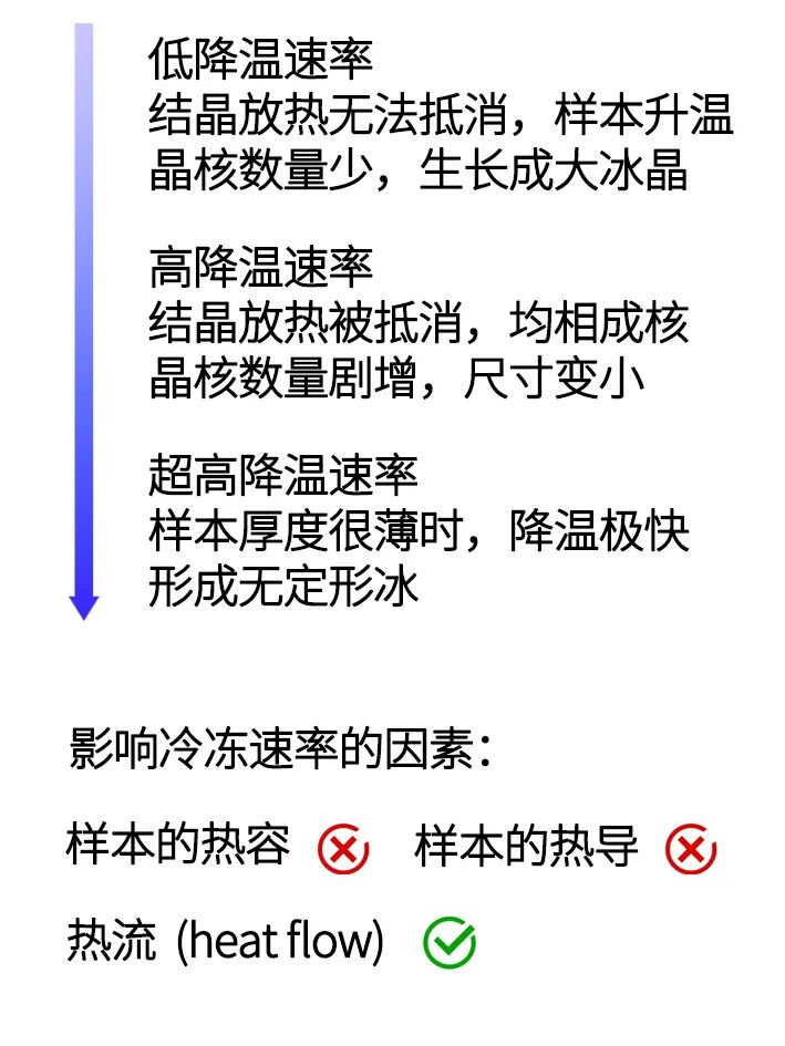影响冷冻速率的主要因素包括样品本身的热容、热导率,以及体系与环境之间的热流传递。在实际操作中,样品的物理性质(热容与热导)通常难以改变,因此提升冷冻速率的关键在于优化热流控制,即选用合适的冷冻方法与介质,以最大化样品与环境之间的热量交换效率。