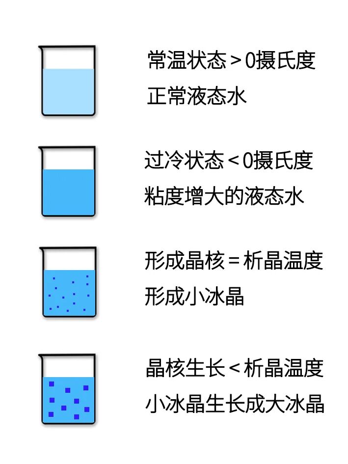 首先,我们必须理解冰晶的形成过程。当液态水从室温开始冷却,温度降至0℃以下时,水进入过冷状态,此时虽未结冰,但其粘度逐渐上升。继续降温至析晶温度时,水中开始形成微小的冰晶,该过程为吸热相变,温度保持恒定。此后随着温度进一步下降,这些晶核逐渐生长为更大的冰晶,最终整体凝固为结晶态固态水,即通常所说的结晶冰。