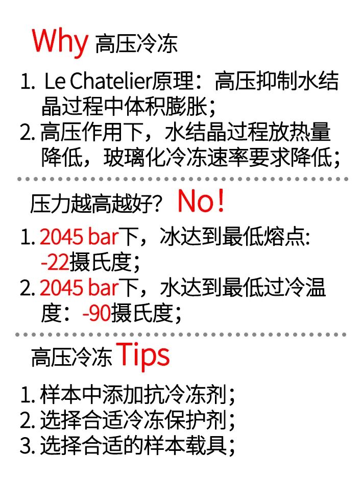 在高压条件下,水结晶时所释放的潜热显著降低,从而减少了对环境热交换速率的要求。这意味着实现玻璃化冰所需的临界冷冻速率也随之降低,因此更容易获得高质量玻璃态冰,最大限度地保留样品的原始超微结构。