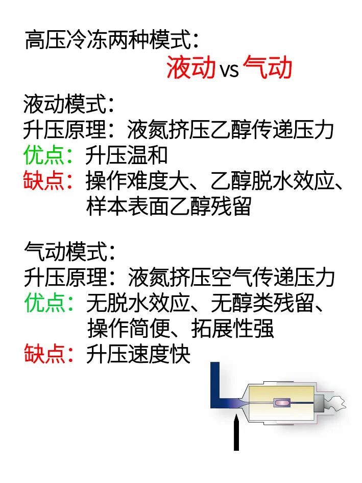 高压冷冻有两种运行模式:液动式和气动式,二者在压力传递介质和操作特点上具有明显区别。